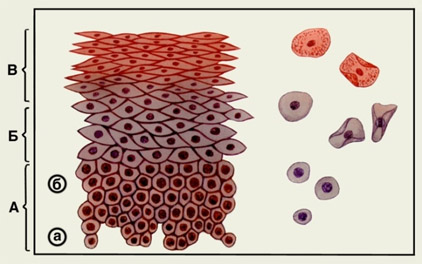Клетки самого нижнего глубокого слоя эпителия в норме имеют округлую форму и одно крупное ядро. Эти клетки обладают спосоностью активно делиться. Постепенно, созревая, они перемещаются в верхние слои эпителия, и превращаются в клетки поверхностного слоя, которые имеют плоскую форму и очень маленькой ядро.