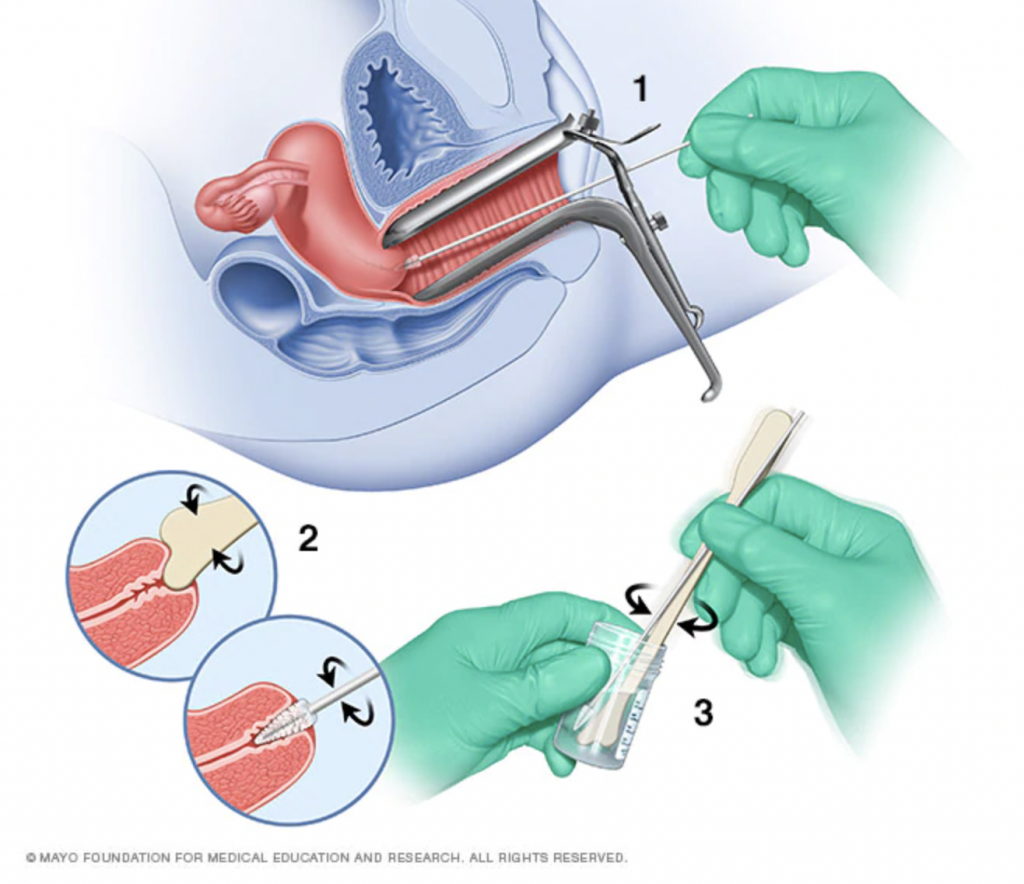 При проведении мазка врач использует вагинальное зеркало, чтобы раздвинуть стенки влагалища и увидеть шейку матки. Затем образец клеток из шейки матки собирается с помощью маленькой конической щетки и крошечной пластмассовой лопатки (1 и 2). Затем ваш врач промывает щетку и шпатель во флаконе с жидкостью (3) и отправляет флакон в лабораторию для тестирования.